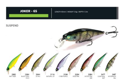 Damiki Joker 65SP este vobler jerk mic si robust de tip suspending. Joker 65SP evolueaza pana o adancime de maximum un metru, iar corpul subtire si echilibrat il face ideal pentru jerking sau twitching. Este echipat cu ochi 3D si are bile in interior. Disponibil in diferite culori, acest model este ideal pentru pescuitul Light/Medium Light la pastrav, biban, clean, bass , avat, stiuca si salau.
