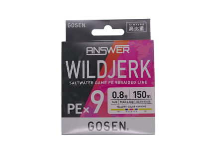 Firul textil Gosen ANSWER WILDJERK PE x 9 Sinking reprezinta evolutia gamei Wild Jerk si este proiectat specific pentru pescuitul la Eging (calamar si sepie) si a fost de catre cel mai faimos si respectat pescar de cefalopode din Japonia, Nobutori Shigemi. Cea mai mare caracteristica a firului este ca foloseste o linie PE de inalta densitate. Comparativ cu firele PE obisnuite, acesta se scufunda mai usor in apa si este mai putin afectat de valuri si vant, oferind o operabilitate stabila si o sensibilitate ridicata. Firul este rezistent la vant, considerat un punct slab in tehnica Eging, si poate fi utilizat confortabil chiar si in conditii adverse. Designul firului a evoluat: constructia din 8 suvite PE plus un miez de fibra de inalta densitate (high-density fiber core) reduce frictiunea, crescand distanta de lansare. Aceasta tehnologie de fabricatie speciala ii confera firului o greutate specifica optimizata, permitandu-i sa penetreze apa si sa fie mai putin afectat de vantul puternic si de valuri. Rezultatul este o manevrabilitate si sensibilitate superioare. In plus, impletitura din 8 suvite contribuie la o suprafata neteda si rotunda, care imbunatateste distanta de lansare si reduce frecarea. In plus, firul beneficiaza de tratamentul unic Gosen, "SG Processing", care imbunatateste hidrofobia (respingerea apei) si adauga o rigiditate si o fermitate moderate. Aceste caracteristici maresc semnificativ manevrabilitatea si sensibilitatea. Firul utilizeaza noua schema de culori "BCM (Bite Catch Marking System)". Culoarea, dezvoltata in urma a numeroase teste si care pastreaza baza traditionala galbena, face posibila detectarea vizuala chiar si a celor mai delicate muscaturi.