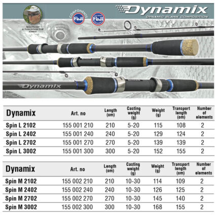 Konger Dynamix Spin = lansete clasice din clasa Medium ce se vor descurca excelent in timpul partidelor de pescuit pe rauri, canale si lacuri . Vor functiona perfect cu naluci de pana la 10cm, rotative marimime 1-4 si oscilante. Actiunea lasetelor Dynamix Spin Medium va va permite sa faceti lansari precise si dinamice si va va ajuta sa castigati controlul asupra pestilor in timpul drilului.