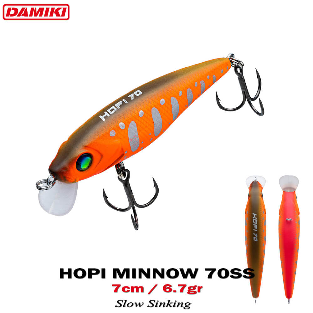 Damiki Hopi Minnow 70 este un vobler de tip Minnow Slow Sinking (scufundator lent), fiind o naluca de dimensiuni medii, extrem de versatila, populara in special pentru pescuitul rapitorilor in rauri si ape curgatoare.Acest model este echipat cu un sistem de echilibrare magnetic (magnetic balance system) care ii optimizeaza greutatea in timpul lansarii, asigurand distante superioare de aruncare si o precizie mai buna, chiar si in conditii de vant. Fiind slow sinking, voblerul se scufunda lent, permitand pescarului sa exploreze eficient straturi de apa diferite si sa ramana mai mult timp in zona de atac a pestilor.