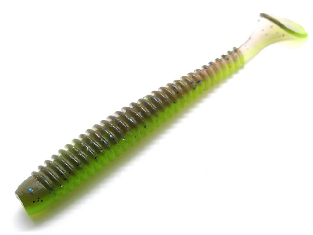 Soft baits HITFISH Tukashine is available in sizes 2.5 and 3.5 inches. This bait is made in the form of an oblong vibrotail with a ribbed body, which will create additional noise in the water, thereby attracting the attention of predators. This lure has a flattened, narrow body that visually increases the volume, while in fact the bait remains rather thin, and a good uniform and natural tail play causes predators to attract attention and provoke them to bite.