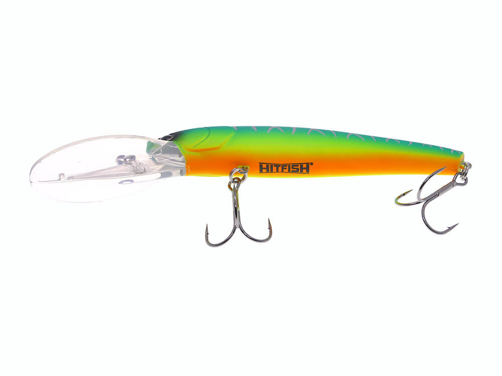 Hitfish TR Deep 115F este un vobler excelent pentru pescuitul la trena la adancime, special conceput pentru a atrage pestii pradatori mari, cum ar fi stiuca, salaul sau somnul. Aceasta masoara 11.5 cm si are forma de vobler minnow, cu o coada bine definita care imita miscarile naturale ale pestilor in apa. Adancimea maxima de scufundare poate atinge pana la 6.4 metri si chiar mai mult de atat, facandu-l ideal pentru zonele cu apa adanca (in special lacurile de munte foarte adanci cum ar fi: Lacul Izvorul Muntelui (Bicaz), Lacul Bezid, Lacul Colibita, Lacul Siriu, Lacul Firiza dar poate fi pescuit si pe rauri cu debit mai mare cu ar fi Dunarea, Olt, Mures, Siret sau Prut. Coada nalucii creeaza o vibratie puternica in apa, captand atentia pestilor aflati la distanta. Hitfish TR Deep este echipat cu ancore de calitate superioara (made in Japan), asigurand o prindere ferma si eficienta. Datorita designului sau robust si al actiunii realiste, acest model este alegerea perfecta pentru pescarii care doresc sa aiba succes in capturarea pradatorilor de dimensiuni mari.
