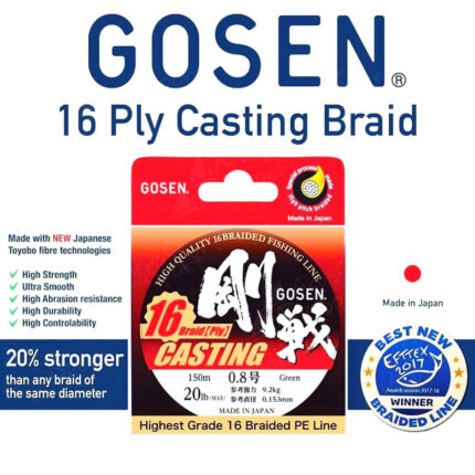 Firul textil GOSEN 16 braid Casting este fabricat din fibre Izanas produse de compania japoneza Toyobo, fibre ce sunt mult mai rezistente decat fibrele Dynemma. In prezent este singurul fir impletit in 16 de pe piata. Acest nou material Cele 16 fire din care este fabricat fac din acesta un fir mai puternic decat orice fir impletit in 8 de pe piata. Are un tratament special impotriva absorbtiei apei, care ajuta mult la rezistenta nodurilor, o densitate mare de impletire, este extrem de neted, incredibil de sensibil atunci cand avem atacuri si este un echilibru excelent intre rigid si moale. Echilibrul dintre toate caracteristicile este rezultatul unui proces numit 4S de catre specialistii marcii japoneze, iar scopul sau este de a minimiza eliberarea fibrei si de a imbunatati lansarea lui, astfel incat firul sa fie potrivit pentru multe tipuri si stiluri de pescuit : Spinning, Casting, Surf Casting, Egging, Light Rock Fishing, precum si in orice alta situatie in care folositi naluci de suprafata sau lucrati la distante apropiate sub nivelul apei, cum ar fi popper, momeli stick si altele.