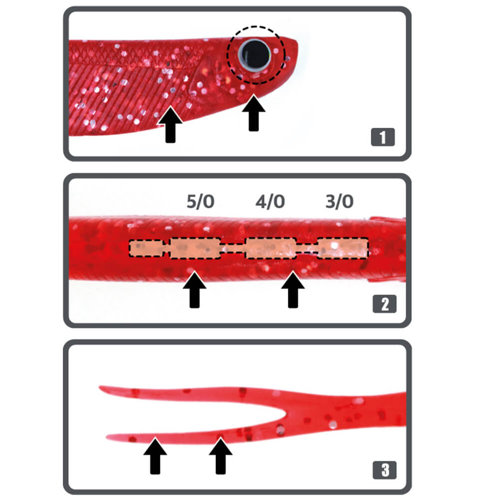 * Partea plata din partea inferioara a cozii si coada mai lunga in forma de “V” au o actiune unica stralucitoare, care atrage speciile de pesti tinta