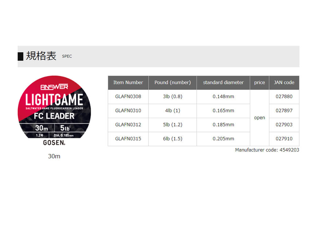 Firul fluorocarbon Gosen Answer Lightgame este o alegere excelentru pentru pescuitul UltraLight sau Light. Firul este transparent cu un indice de refractie aproape identic cu apa. Incredibil de rezistent la abraziune, complet rezistent la razele UV si foarte moale. Spre deosebire de altei fire, fluorocarbonul nu absoarbe apa, ceea ce inseamna ca nu imbatraneste si este rezistent la apa sarata, rezista la agenti chimici si poate fi folosit la toate metodele de pescuit cu inaintas (leader) mai ales in apele foarte limpezi. Firul este frabricat in Japonia.