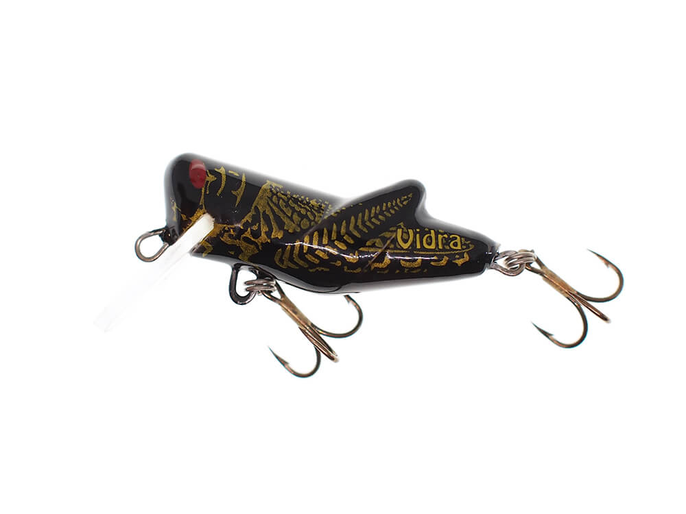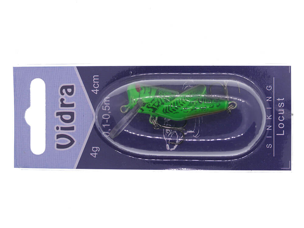 Vidra Lures Locust este o naluca de suprafata cu un design realist in special pentru pescuitul cleanului sau a pastravului pe raurile mici sau medii, precum si a bibanilor in apele statatoare de-a lungul vegetatiei acvatice. Acesta imita perfect o lacusta (cosas). Ca momeala naturala preferata pentru multe specii de pesti rapitori care se hranesc in startul de apa de suprafata, lacustele Vidra Lures sunt o necesitate in arsenalul pescarilor de spinning Light. Vibratia lor depinde de modul de recuperare si ofera cele mai bune rezultate in apa putin adanca si un curent cu putere medie, cu lansari in amonte si recuperare in aval, adancimea maxima la care poate cobora voblerul fiind de 50cm. Bilele metalice din corp ofera echilibrul necesar si in acelasi timp contribuie la cresterea activitatii voblerului, emitand un sunet zgomotos atunci cand se deplaseaza. Se caracterizeaza printr-o lansare foarte buna si foarte precisa. Voberele sunt echipate cu doua ancore foarter ascutite VMC, nr.10